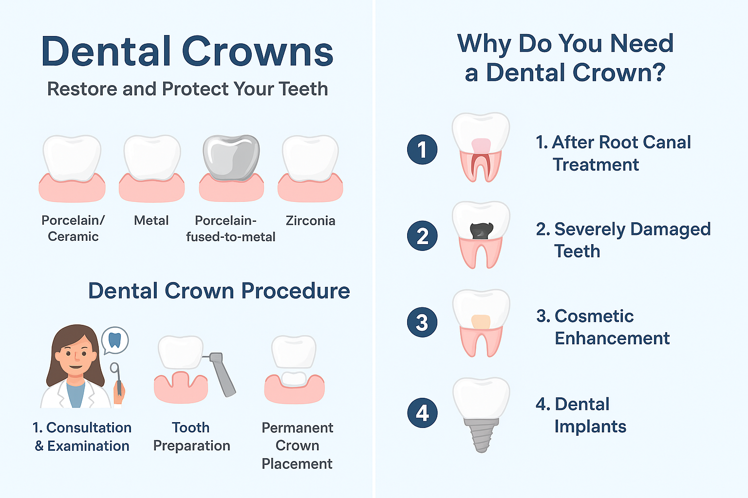 A healthy smile is essential for confidence and oral health. Dental crowns are a trusted solution to protect teeth weakened by decay, trauma, or root canal treatment (RCT), while restoring their appearance and function.
